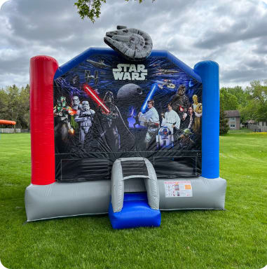 From a galaxy far, far away the Official STAR WARS bounce house, whether you are a Rebel or a Sith Lord, everyone will enjoy this bounce house that is out of this world. Featured at the front of the bounce house are the iconic characters from the Star Wars films. There is space for up to six young Padawans at a time.