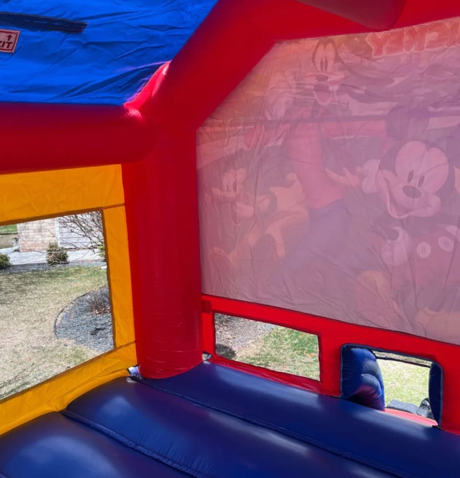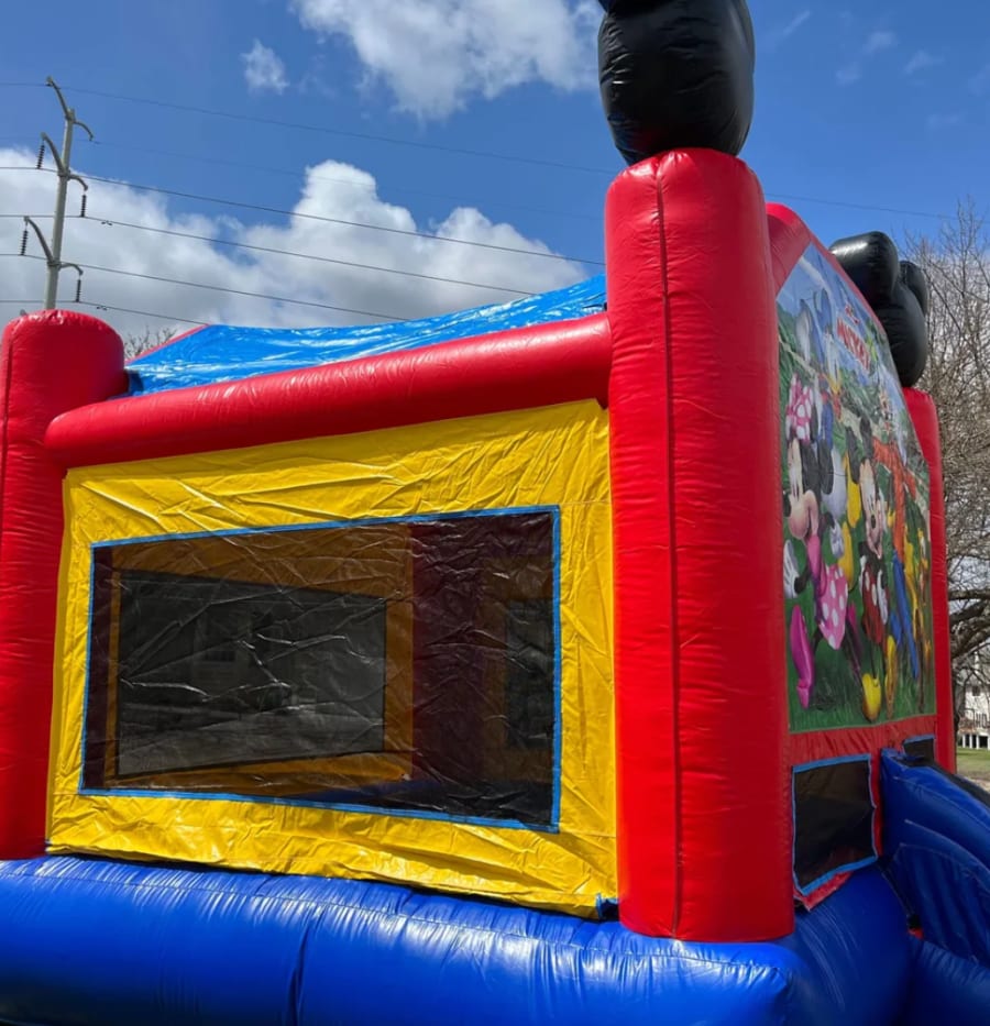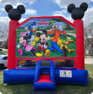 Come along with Mickey and Friends on a fun adventure with MICKEY AND FRIENDS bounce house. Mickey Mouse himself greets everyone as they enter the bounce house. The rest of his friends Minnie, Goofy, Donald, and Pluto are there two smiling, ready to have a great time. The iconic Mickey Mouse ears are at the tops of the vertical pillars in the front of the bounce house. The bounce house designed in red, blue, and yellow colored vinyl, invites everyone to have a great time. There is plenty of space for up to 6 best pals at a time.