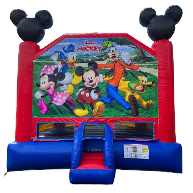 Come along with Mickey and Friends on a fun adventure with MICKEY AND FRIENDS bounce house. Mickey Mouse himself greets everyone as they enter the bounce house. The rest of his friends Minnie, Goofy, Donald, and Pluto are there two smiling, ready to have a great time. The iconic Mickey Mouse ears are at the tops of the vertical pillars in the front of the bounce house. The bounce house designed in red, blue, and yellow colored vinyl, invites everyone to have a great time. There is plenty of space for up to 6 best pals at a time.