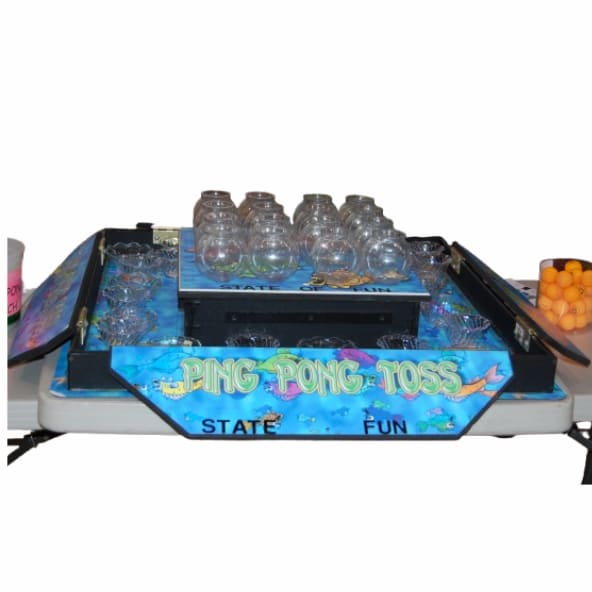1) Hand the player a set number of ping pong balls (typically 3-5). 2) Explain the objective is to toss the balls into the designated cups and fishbowls. 3) Enforce the rule that the ball must land and stay in a cup/bowl to count as a win. 4) Allow the player to take their shots from the designated throwing line. 5) If the player successfully lands the required number of balls, they win a prize. 6) Reset & Repeat: Retrieve the balls and prepare for the next player.
