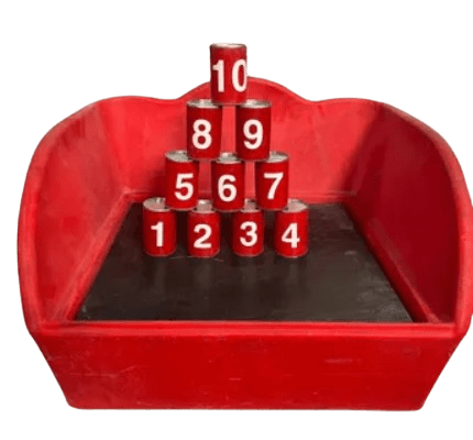 1) Stack the cans in a pyramid formation on the platform. 2) Hand the player a set number of bean bags or balls (typically 3). 3) Explain the objective is to knock down all the cans with the given throws. 4) Enforce the rule that the player must throw from behind the designated line. 5) If the player knocks down all the cans within the given attempts, they win a prize. 6) Reset & Repeat: Restack the cans and prepare for the next player.