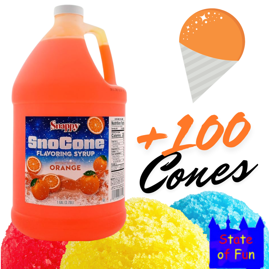 Stock up for hot days with the 100 Servings: Orange Snow Cone Syrup Pack. This bulk-ready kit pairs one gallon of orange snow cone syrup with 100 sturdy cones. Perfect for field days, fundraisers, birthday parties, and concession stands. Ready to serve. Fast to set up. Big on flavor.