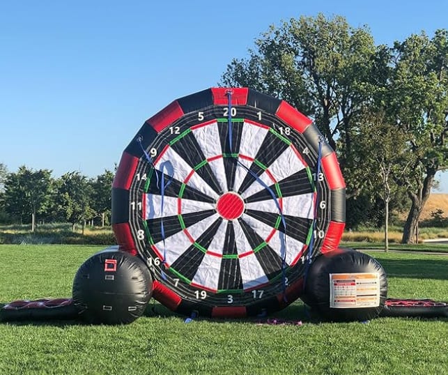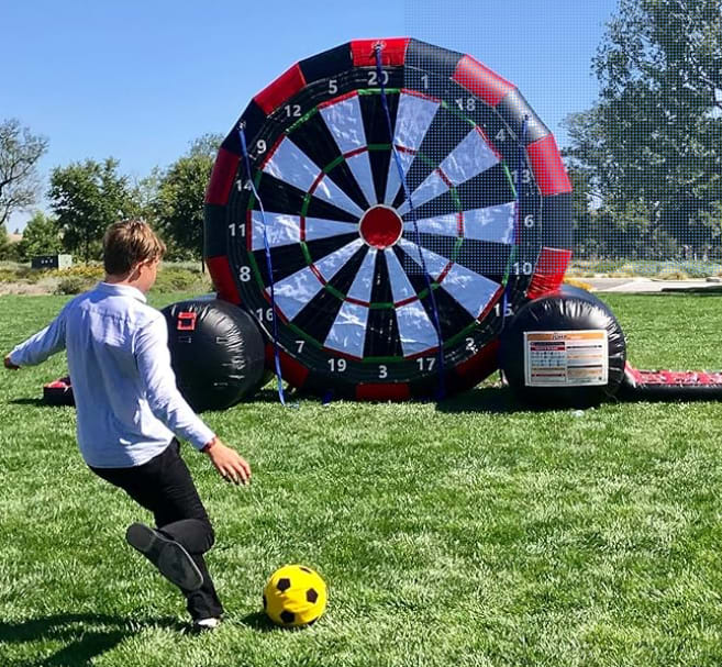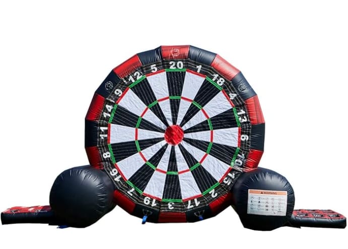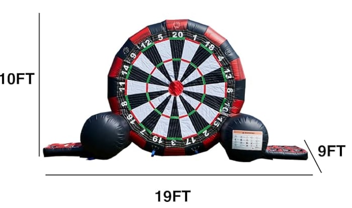 Step up and take your shot with our giant inflatable soccer dart board! This exciting game combines the fun of soccer with the challenge of a classic dart board, creating endless entertainment for players of all ages. But that’s not all, this inflatable also features a baseball banner game on the back and optional foldable side games like Tic Tac Toe and even a fun drinking game for the adults (can be removed)! Kick the special Velcro soccer balls and aim for the bullseye to rack up points, swing for the fences in the baseball challenge, or test your strategy with classic side games. Perfect for birthday parties, family gatherings, weddings, school events, and more, this game can be set up indoors or outdoors, creating unforgettable memories with your loved ones.