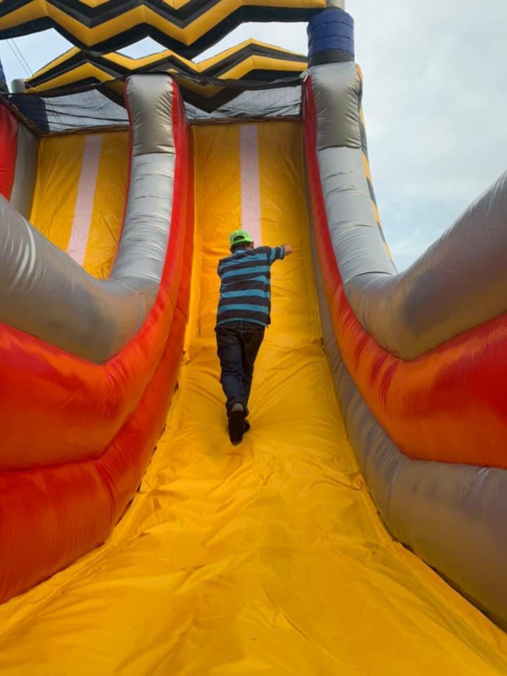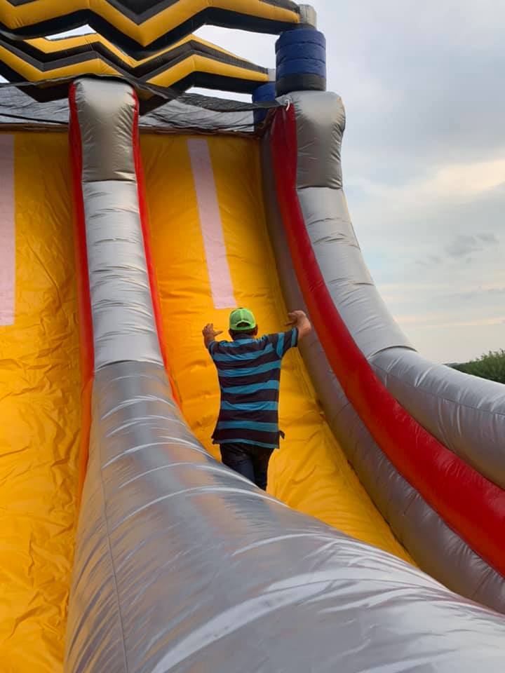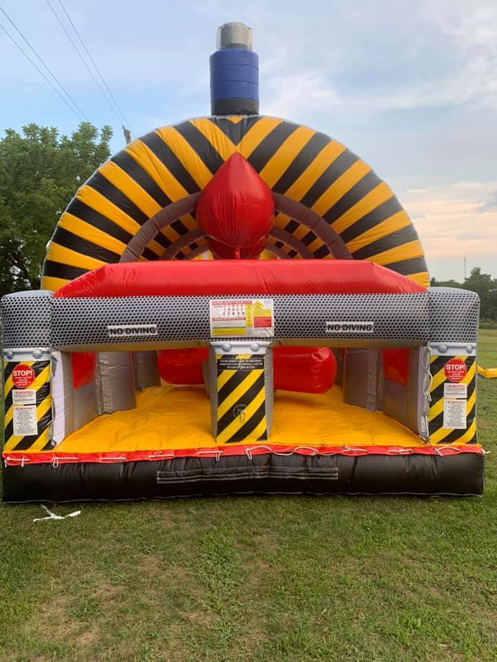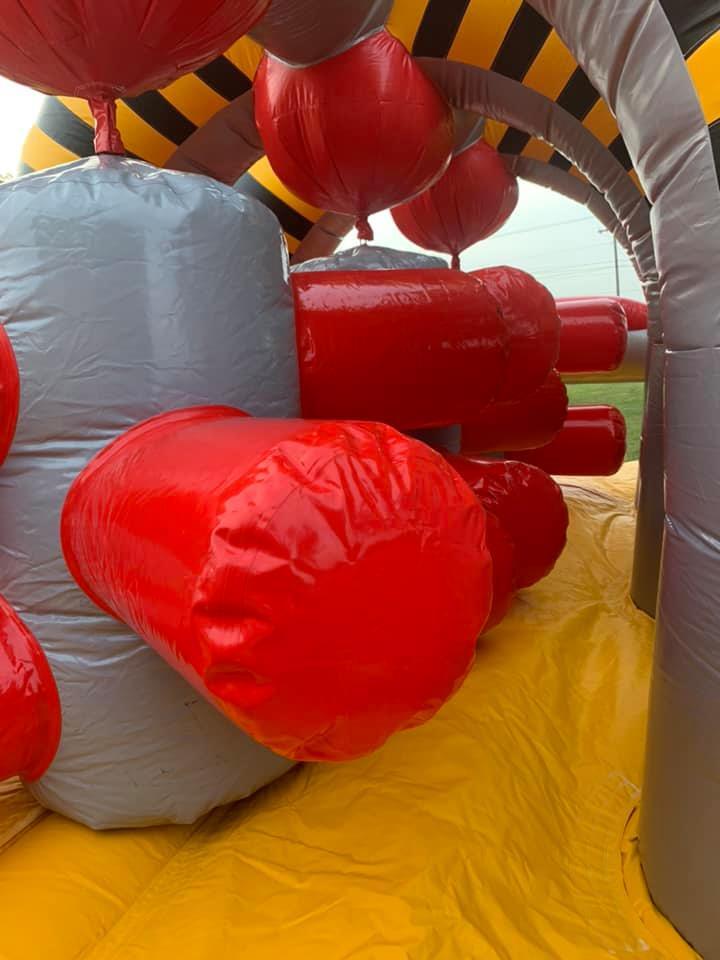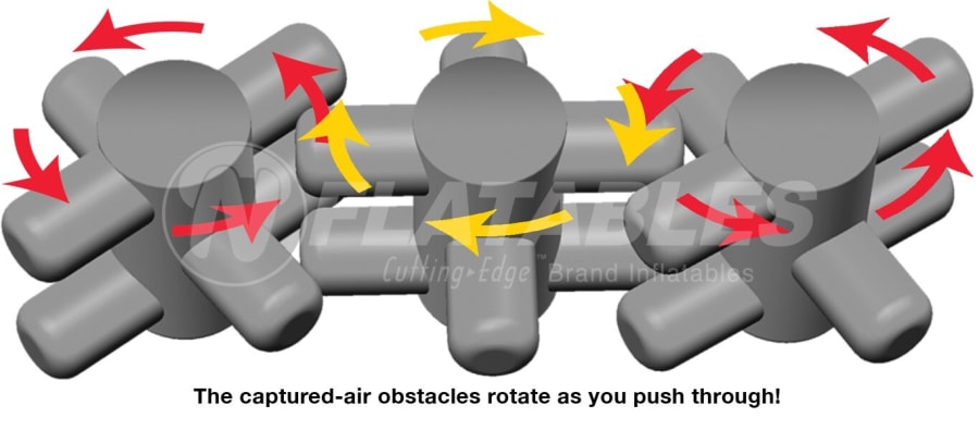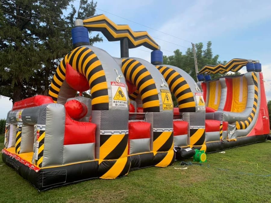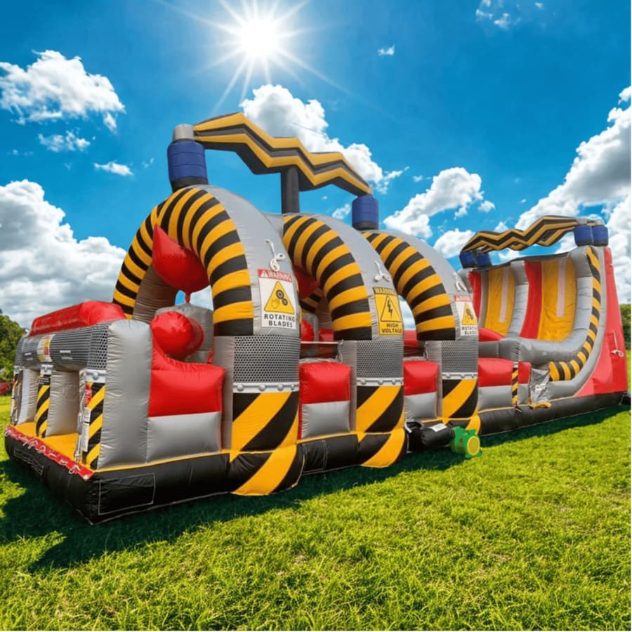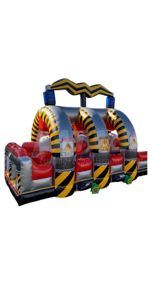 The Grinder takes inflatable obstacle courses to the next level with its unique spinning challenge! Featuring three massive grinding turnstiles that rotate in opposite directions, this course pushes competitors back as they fight to break through. The ultimate test of speed and agility comes at the end—racing up the warped wall to ring the cowbell and claim victory! For even more excitement, pair with the 18' High Voltage Slide